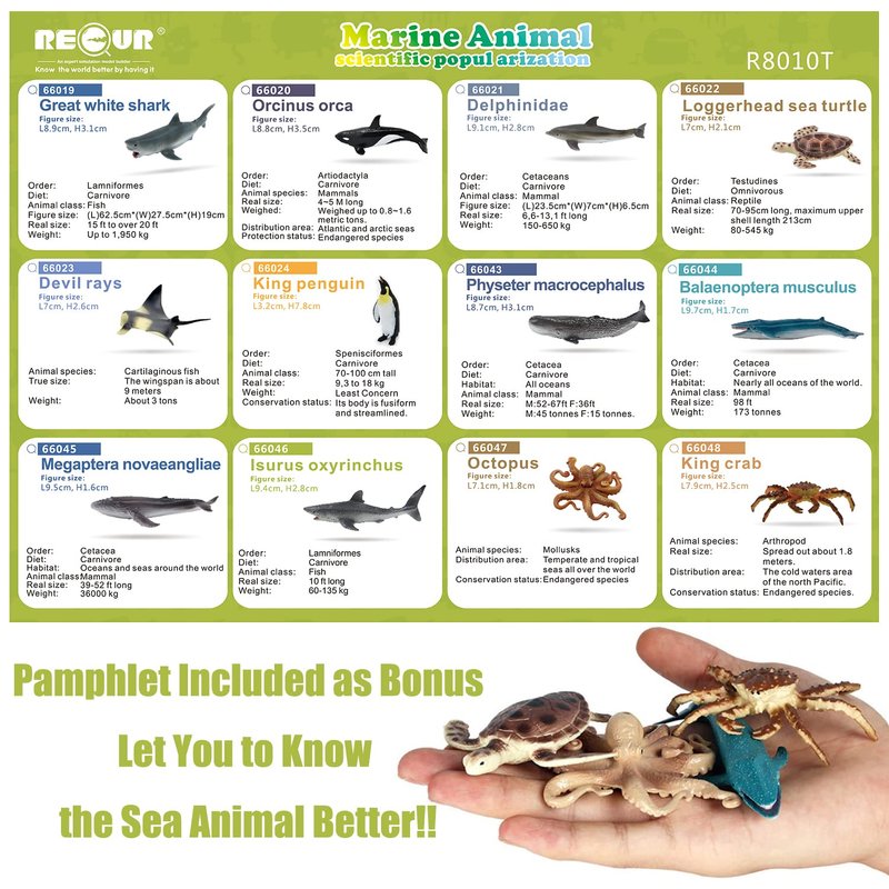 - 【12Pcs Mini Sea Animal Toys with Gift Packaging】12 pack realistic sea animals packed in a nice plastic tube. Popular ocean animal included, such as octopus, king crab, penguin, great white shark, sea turtle, dolphin, lots of kinds of whale and devil rays and so on