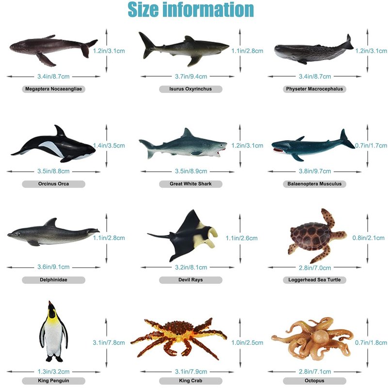 12Pcs mini size of realistic sea animals toys. The average size is about 3-4 inches.