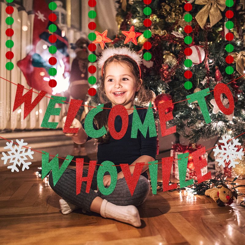 - What you will get: 1pcs red green glitter Welcome To Whoville banner and 1pcs red&green circle dots garland banner,perfect for Christmas party decoration,worth buying it!!