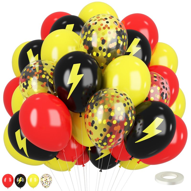 • 12 inch red yellow black balloons: Package contents include red balloons, confetti yellow black balloons, yellow balloons, black lightning printed balloons, a balloon ribbon. The color combination satisfies all your party imagination and starts a wonderful party carnival.