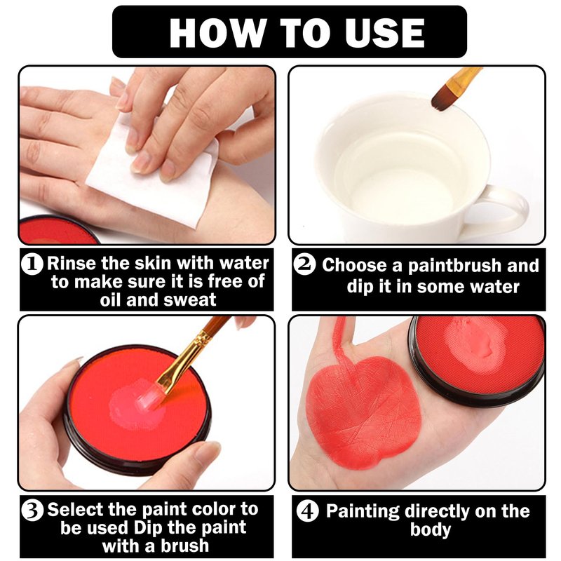 - 【Easy to Apply & Remove】Dip a little water with a brush or finger,mix with the paint,apply on the body,and you can paint the desired makeup effect.It can be easily removed by wiping with water or a damp cloth after use.