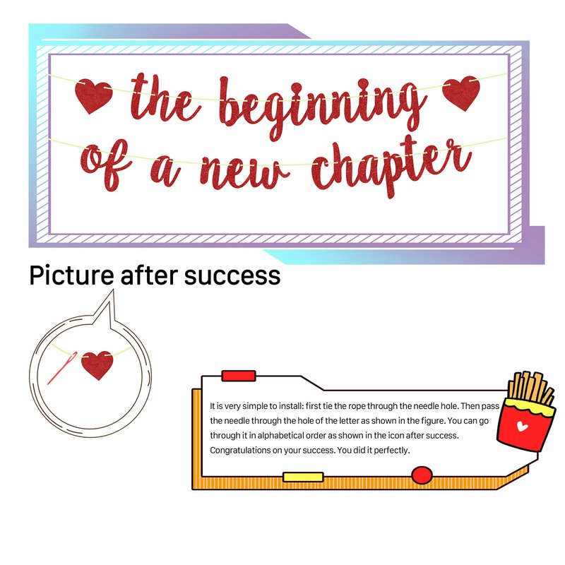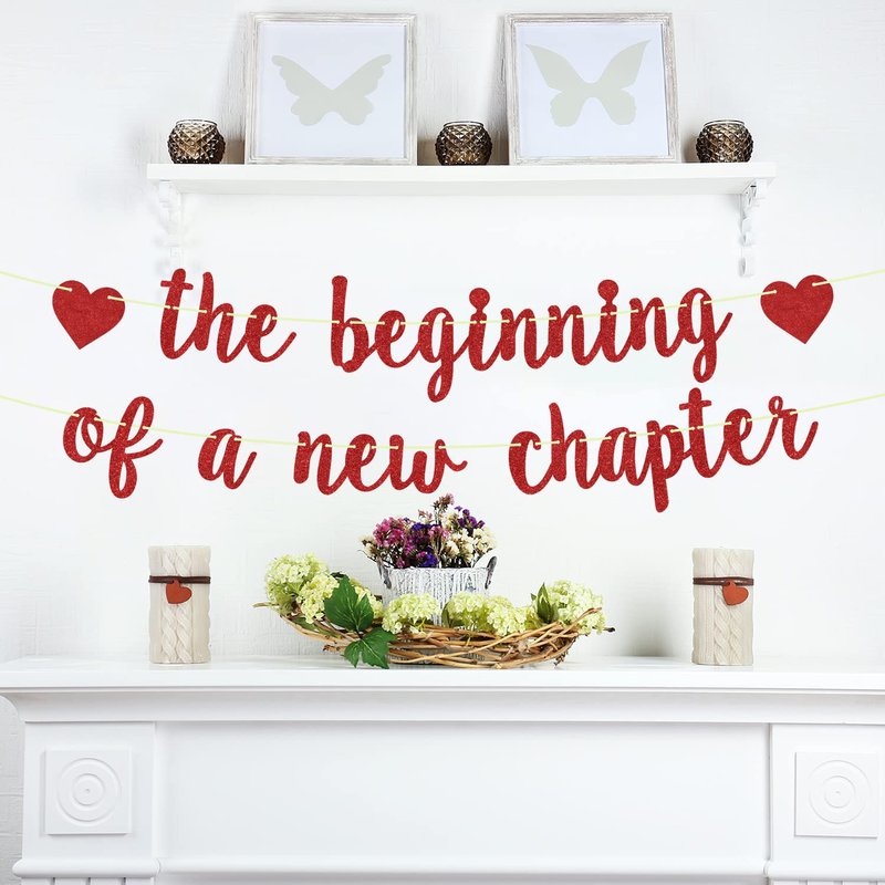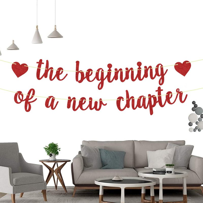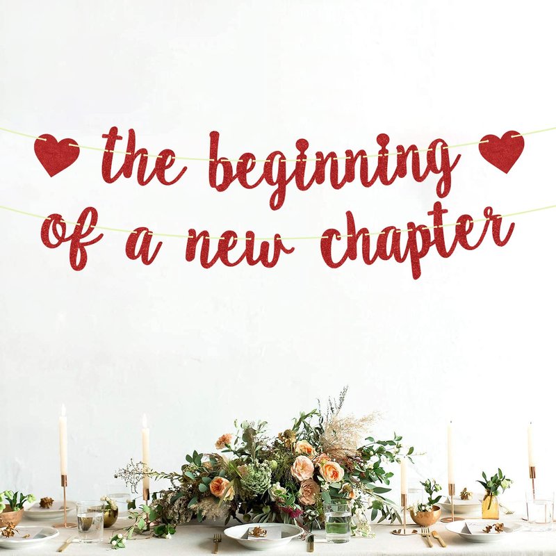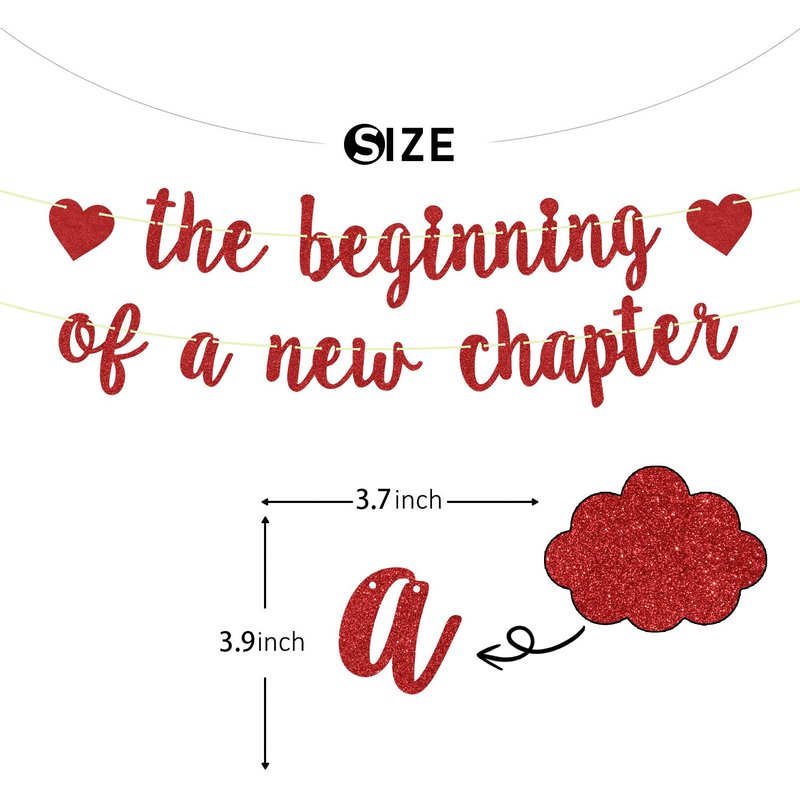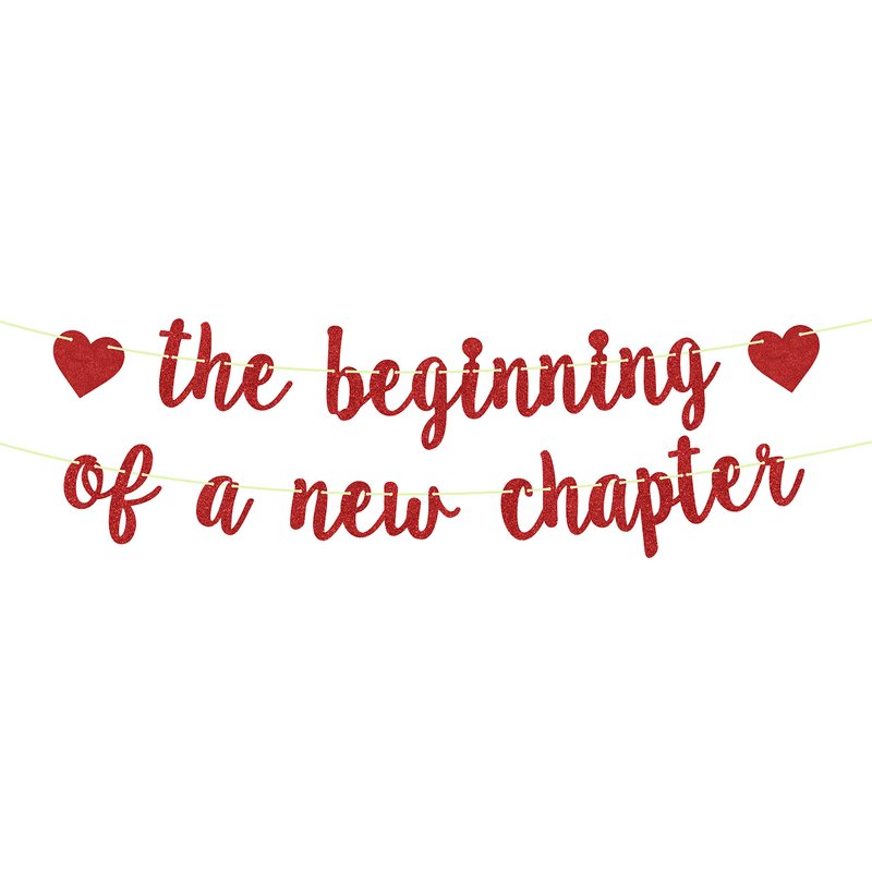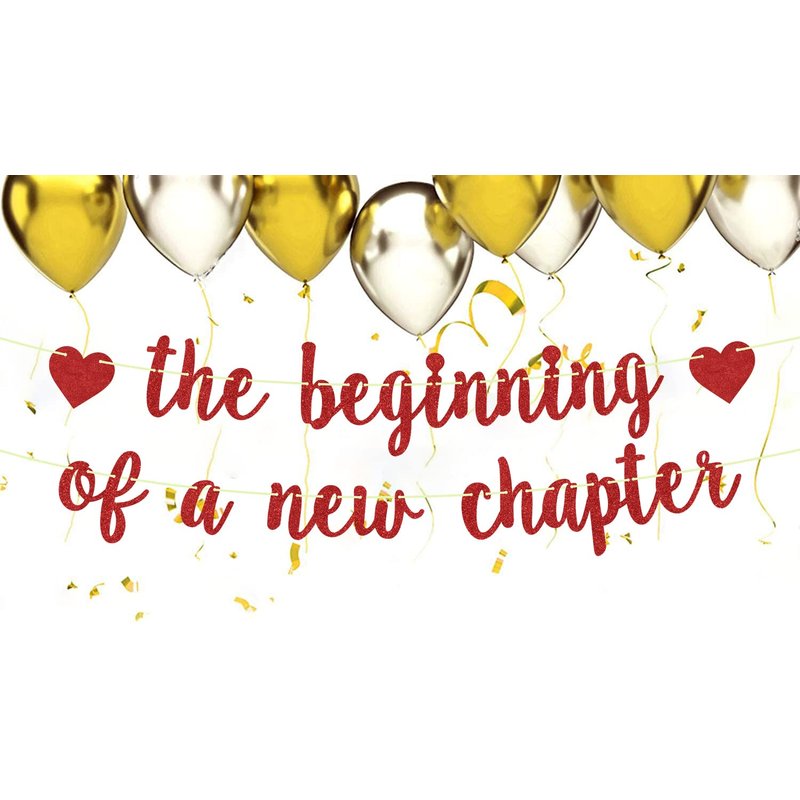 - Content: 1Pcs The Beginning of A New Chapter Banner ,Glittery material adds a high-end feel to the party.Note: After receiving the product, Letters cardstock and ribbon come separately, you need to connect the banner by yourself.