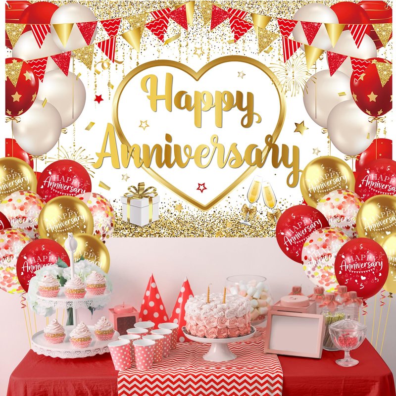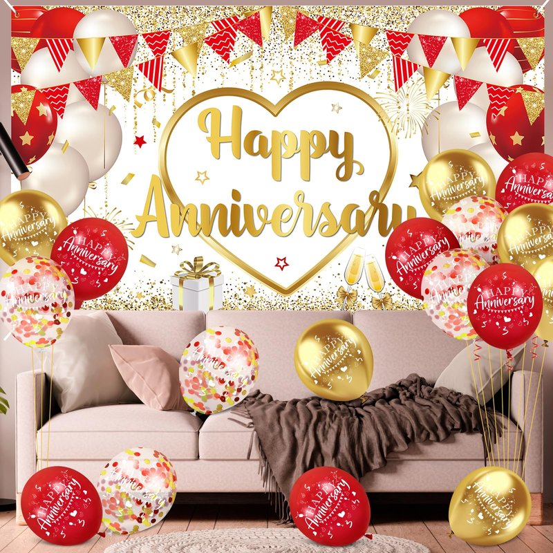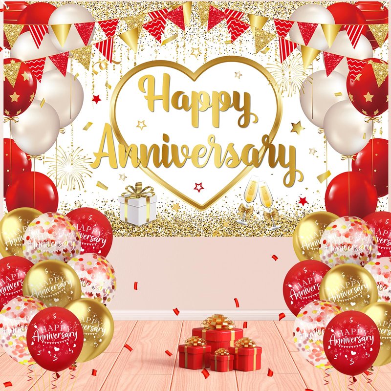 - 【Red Gold Anniversary Party Decorations】: The package included a red gold happy anniversary banner and 18 pieces of red gold happy anniversary balloons, which is printed with a large gold heart and eye-catching “Happy Anniversary” writing, easily create a loving anniversary party