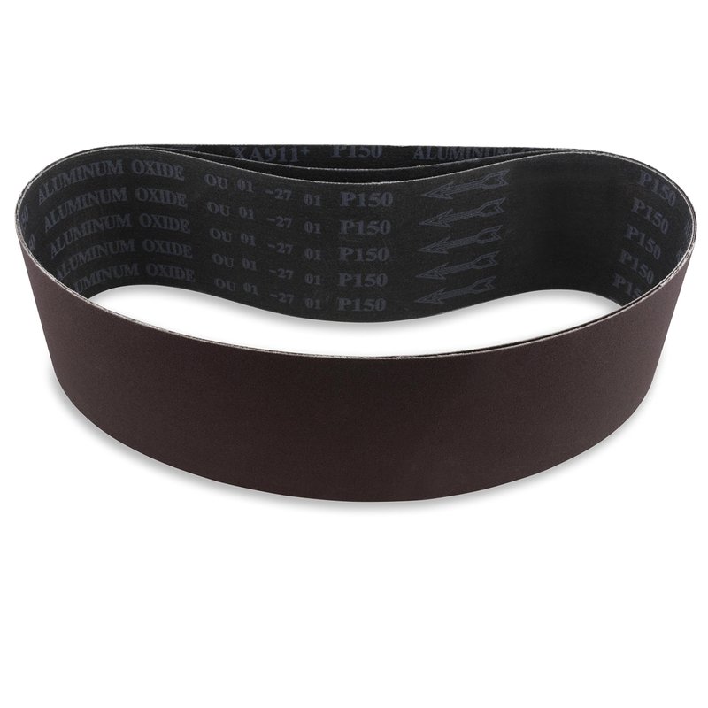 4" X 24" multipurpose Wood and Metal Abrasive Sanding Belts. 220 grit. Sold in packs of 3. Aluminum Oxide (A/O). Open coat, heavy X weight cloth backing. High quality and long lasting industrial abrasive sanding belts work great on softwoods and hardwoods. Resin over resin bonding. Bi-directional tape joint. Dry applications. Assembled in USA.
