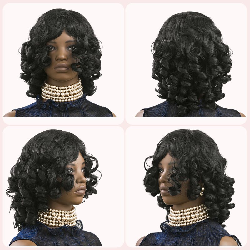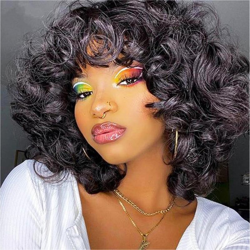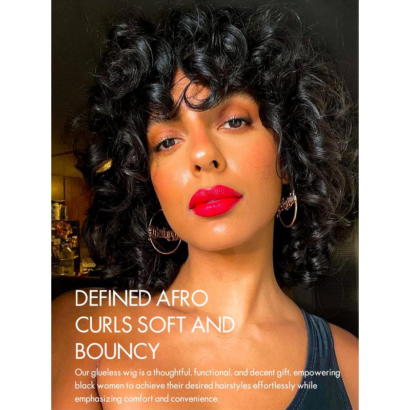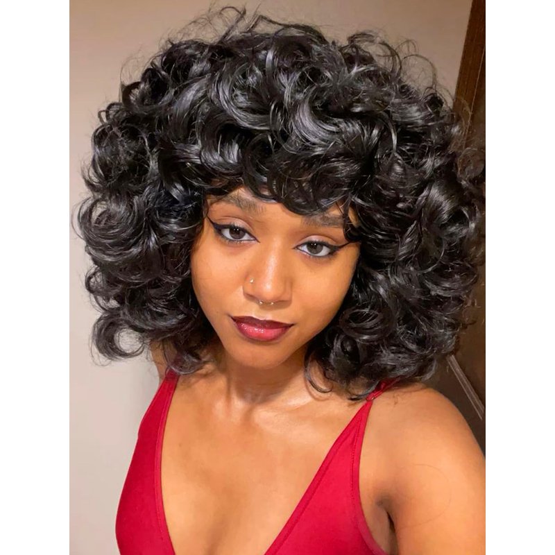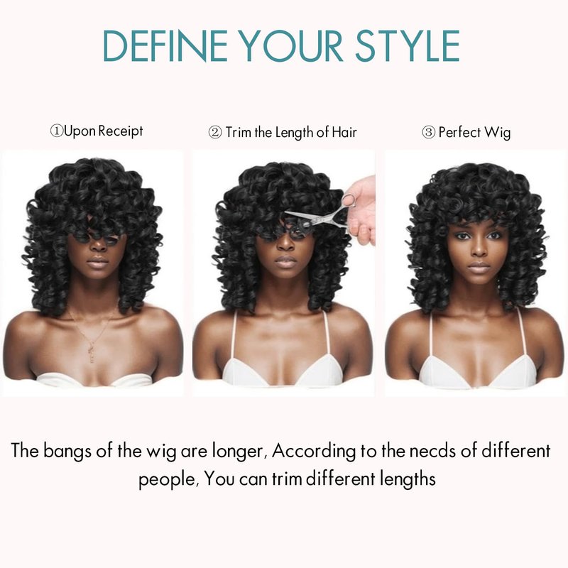 - πVersatile Natural Black Color: Whether you have fair or dark skin, our Curly Wig with Bangs in a natural black hair color will effortlessly match your complexion, enhancing your beauty and adding an extra touch of sexiness. It blends seamlessly, resembling your own hair.