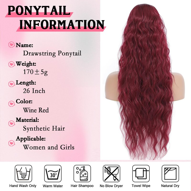 Red Ponytail Extension Drawstring Ponytail for Women 26 Inch Burgundy Curly Wavy Pony Tails Hair Extensions Synthetic Hairpiece for Women Daily Party Use, Wine Red
