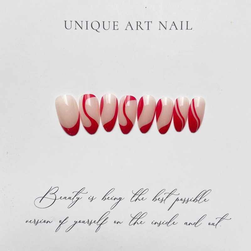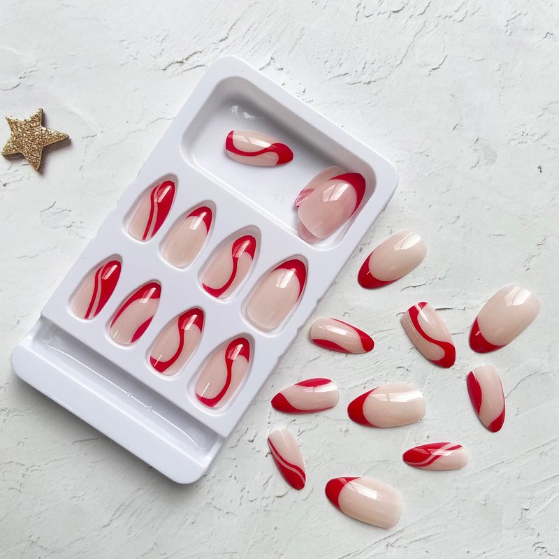 Medium Press on Nails with Design Almond Fake Nails French Stick on Nails Red Nails for Women Manicure