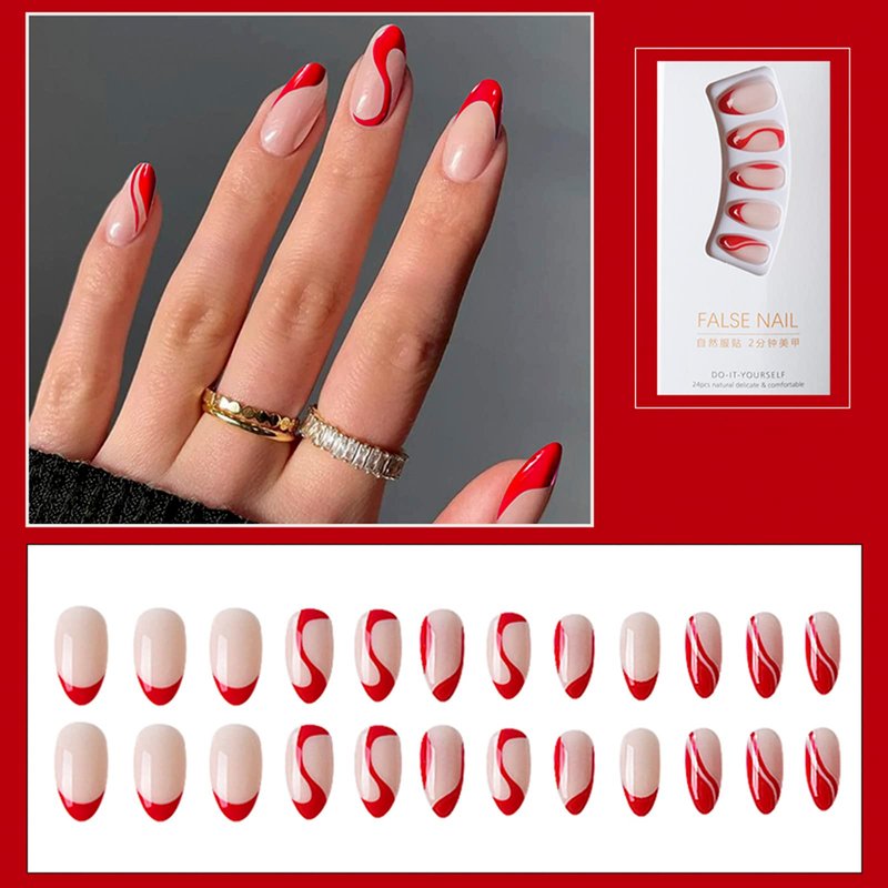 Red Press on Nails French Tip Fake Nails Almond Shape False Nails with Red Swirl Designs Full Cover Acrylic Nails Medium Stick on Nails Glossy Glue on Nails Red Nail Tip Cute Artificial Nails 24Pcs