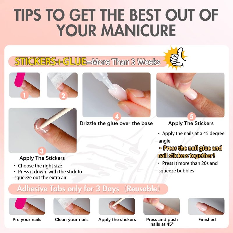 2.Please note that the nail glue is not included.If you want it last for a longer time,please use nail glue instead of the nail stickers.