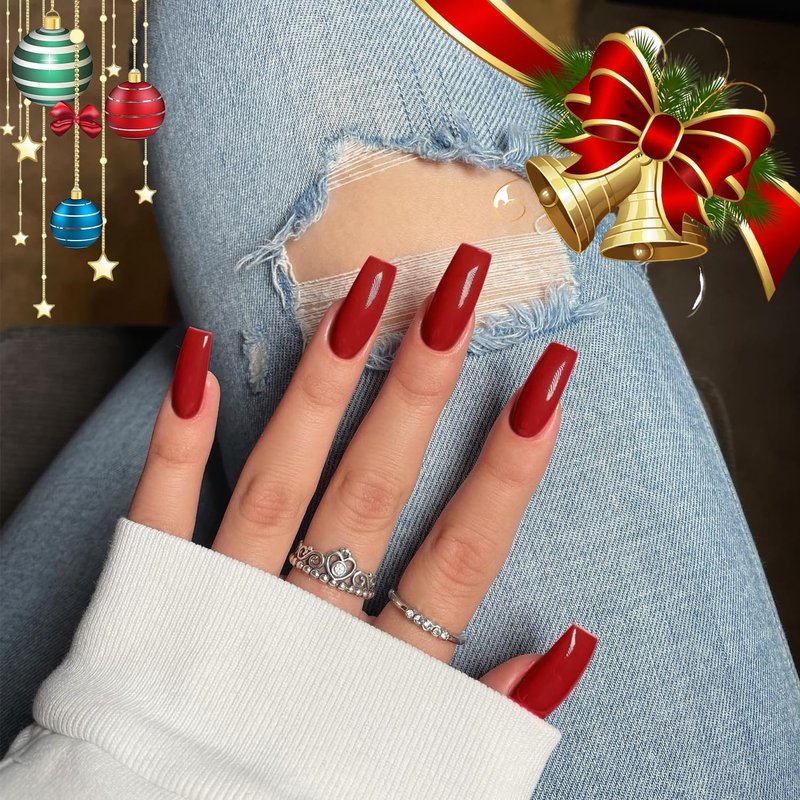 Red Press On Nails Medium Long Square, Xcreando Medium Coffin Nails Acrylic Nails Press ons Glue on Nails Medium Length, Solid Color Fake Nails for Women Christmas Holiday Thick Artificial Nails