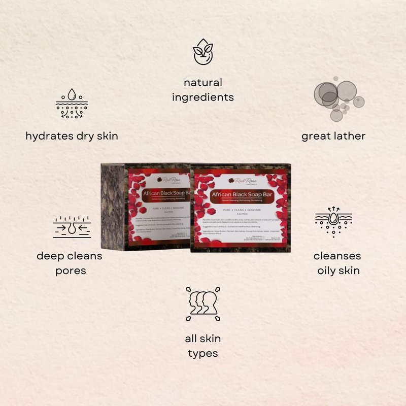 - African Black Soap, an ancient skincare secret, originated from West Africa and has been passed down through generations. This natural, plant-based soap offers numerous benefits for a variety of skin types. Its hydrating and soothing properties help maintain the skin's moisture, while the deep cleansing abilities remove excess oil and impurities. The soap is also known for gently calming all skin types, including the appearance of skin with acne.