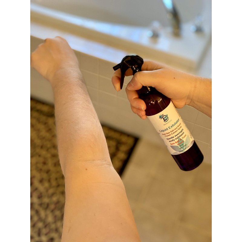 New Super Fruit and Sea Salt Liquid Exfoliator. Time to dump the endless scrubbing with a luffa or other exfoliator to reveal age defying skin. This new formula makes it so much easier. Simply spritz over body before bed. It smells great and as it dries and sinks deep into your skin it helps to loosen dead skin cells. When you shower in the morning use a washcloth to wipe away dead skin. Follow with one of our top selling crepey skin creams.Use as often as desired. Comes in an 8 oz spray bottle.