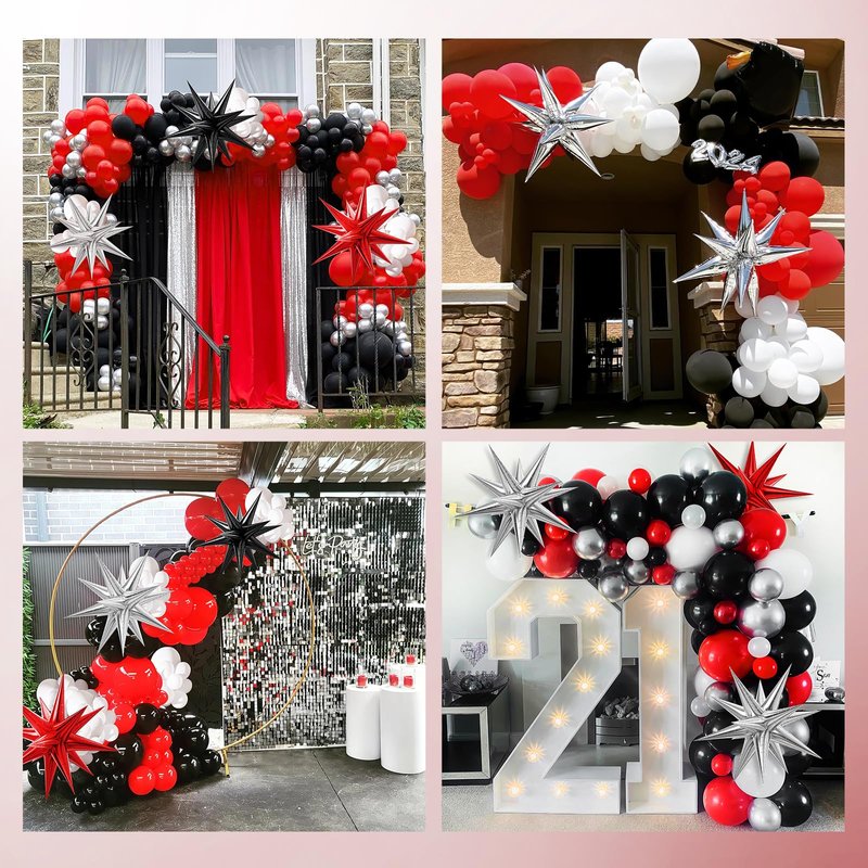 - Package Includes:The red and black balloon arch kit includes 36pcs red balloons 18inchx1, 12inchx5, 10inchx10, 5inchx20, 37pcs black balloons 18inchx2, 12inchx5, 10inchx10, 5inchx20, 21pcs metallic silver balloons 10inchx10, 5inchx10, 20pcs white balloons 10inchx10, 5inchx10, 12inch silver confetti balloonsx8, 22inch foil balloonsx3, glue dotsx60, black ribbonx1,decorative stripx1