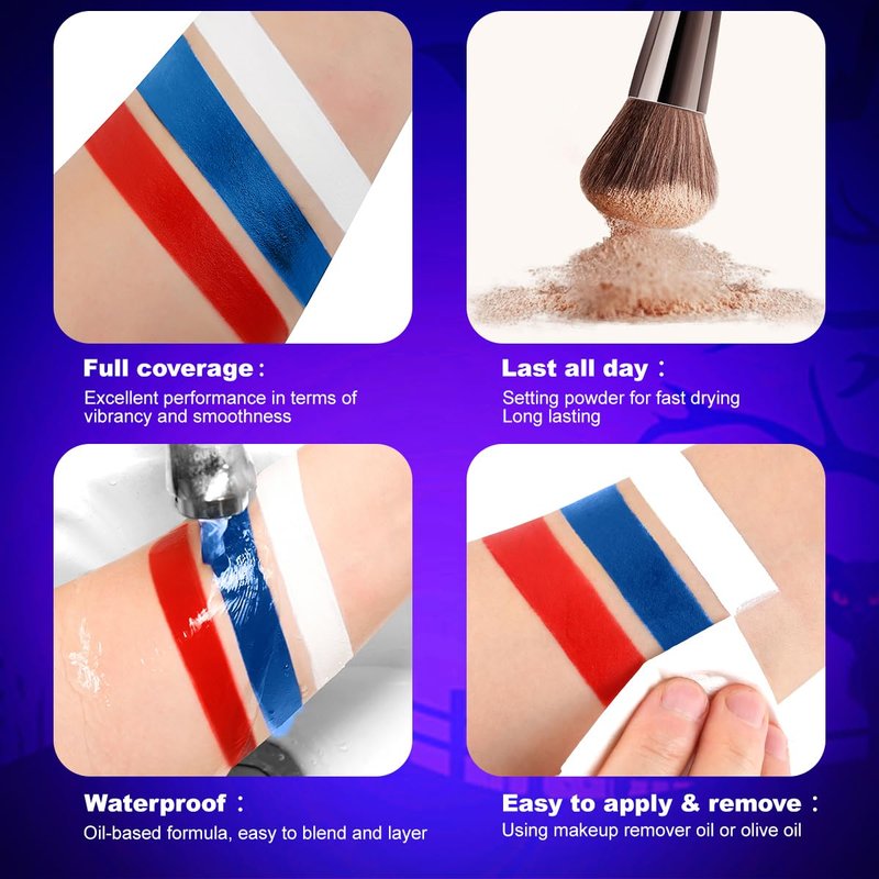 - Versatile for Multiple Occasitions: This halloween face paint makeup is applicable in stage shows , circus acts, patriotic events, cosplay and fancy dress parties, enhancing artistic and character expressions while showing pride.