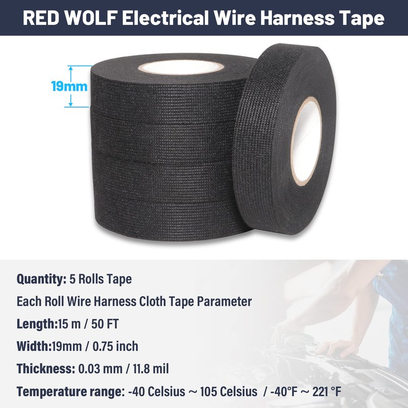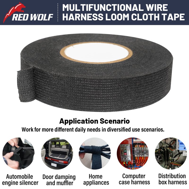RED WOLF Wiring Harness Tape High Temp Wire Cable Loom Self-Adhesive Fabric Tape for Electrical Automotive Engine Harness Wrap Protection Noise Damping Cables Fixed 3/4 Inch x 50 FT 5 Rolls