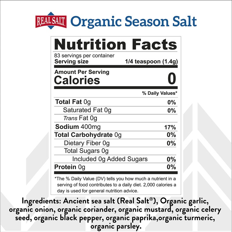 Real Salt Natural Season Salt combines organic seasonings and herbs with the unique flavor of America’s only ancient pink sea salt. Become the master of your grill— Real Salt Season Salt is perfect for steak, lamb, fish, burgers, even veggies and potatoes. People will ask how you got such amazing flavor! Not only will you love the harmonious mixture of savory flavors, you’ll love knowing that you’re using clean, healthy ingredients you can feel good about. Our Organic Season Salt is a combination of Real Salt and organic spices. Now you can enjoy the great taste of Real Salt together with a zesty seasoning flavor you'll love! Ingredients: Real Salt, Organic Garlic, Organic Onion, Organic Corriander, Organic Mustard, Organic Black Pepper, Organic Paprika, Organic Celery Seed, Organic Turmeric, & Organic Parsley. (Kosher Certified by OU)