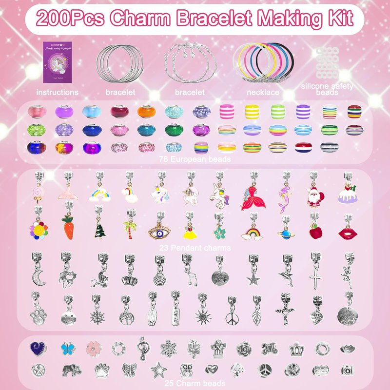 Redtwo 200 Pcs Charm Bracelet Making Kit, Friendship Jewelry Making Supplies Unicorn/Mermaid/Birthday Gifts Toys for Teen Girls Age 4 5 6 7 8 9 10 12 Year Old, Arts Crafts for Kids Ages 8-12