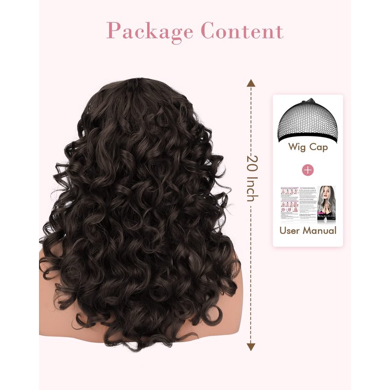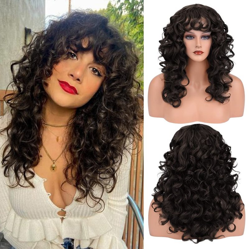 REECHO Curly wigs with Bangs for Women, Black Brown Curly Shag Synthetic Hair Replacement Wig for Daily Use Party Cosplay - 20 Inch Black Brown