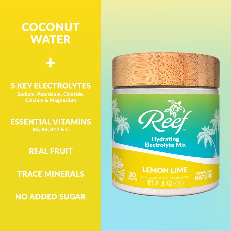 Reef Replenish Lemon Lime Hydration Mix contains five key electrolytes (magnesium, calcium, potassium, chloride, and sodium) to help maintain optimal hydration levels and electrolyte balance. Powered by coconut water and enriched with essential vitamins such as C, B3, B6 and B12, this mix promotes immune health and overall wellness. It also includes coral calcium, renowned for its bioavailable calcium and essential trace minerals that support bone health and metabolic function. Reef Replenish electrolytes powder has no added sugar, it’s an excellent choice for those seeking an alternative to the energy depleting, high sugar beverages. This healthy hydration mix is specially designed for individuals with active lifestyles, Reef Hydration Mixes provide a convenient and efficient way to stay hydrated every day.