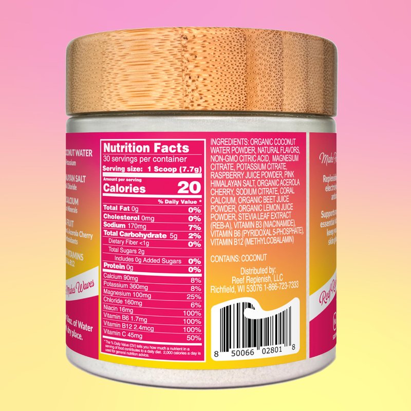 Reef Replenish Raspberry Lemonade Hydration Mix contains five key electrolytes (magnesium, calcium, potassium, chloride, and sodium) to help maintain optimal hydration levels and electrolyte balance. Powered by coconut water and enriched with essential vitamins such as C, B3, B6 and B12, this mix promotes immune health and overall wellness. It also includes coral calcium, renowned for its bioavailable calcium and essential trace minerals that support bone health and metabolic function. Reef Replenish electrolytes powder has no added sugar, it’s an excellent choice for those seeking an alternative to the energy depleting, high sugar beverages. This healthy hydration mix is specially designed for individuals with active lifestyles, Reef Hydration Mixes provide a convenient and efficient way to stay hydrated every day.