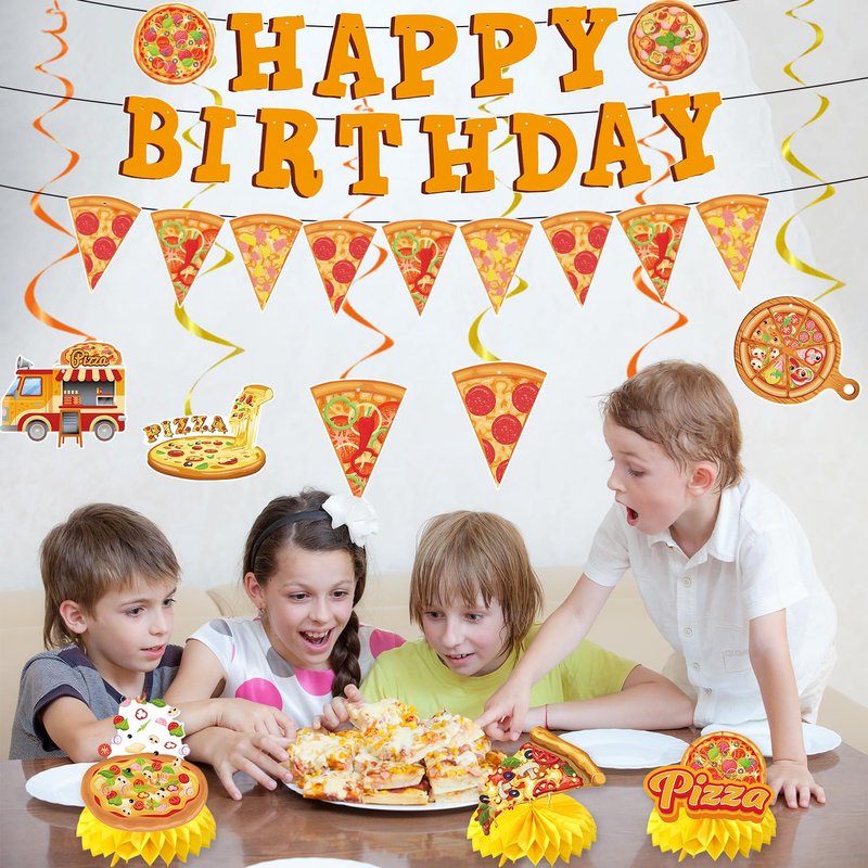 Creative Design: The birthday decorations are based on pizza, with novel and interesting designs, including elements such as pizza slices, pizza boxes and pizza toppings, adding a unique visual enjoyment to the party