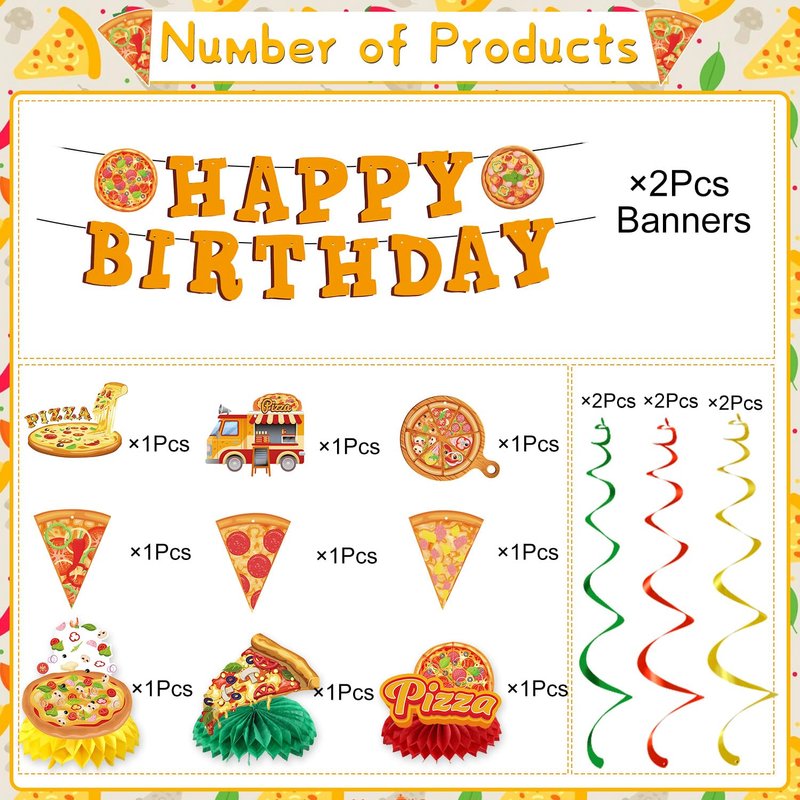 You will receive 12 pieces of pizza-themed birthday party decorations, including 3pcs birthday banners, 6pcs pizza ceiling decorations, 3pcs honeycomb center decorations.
