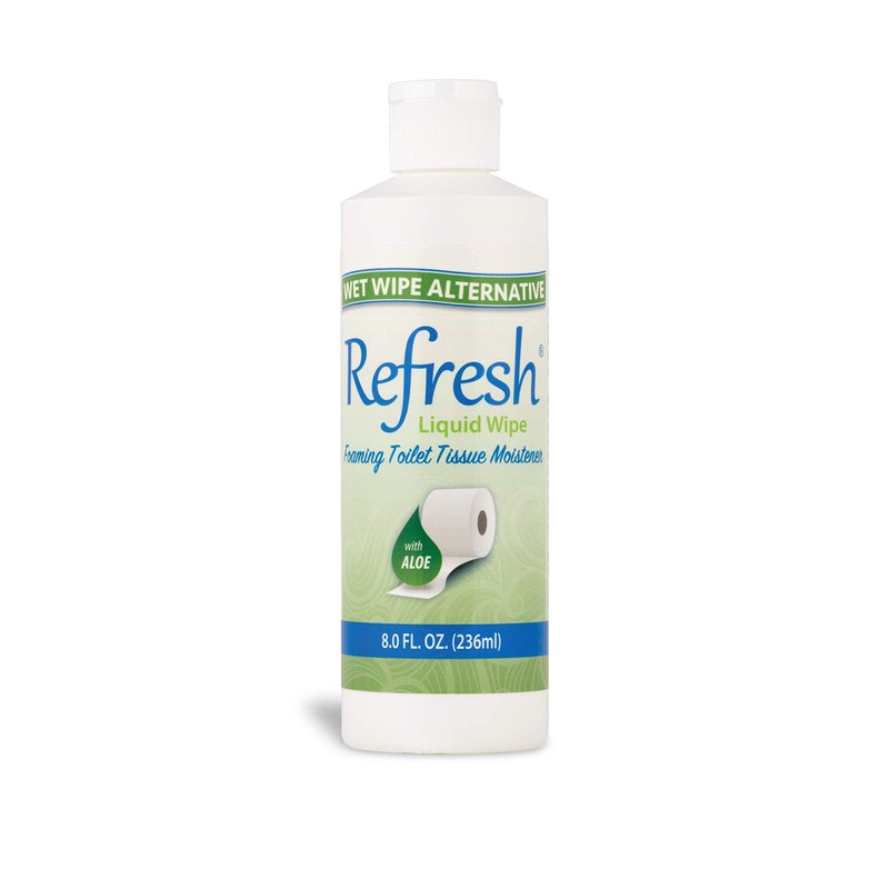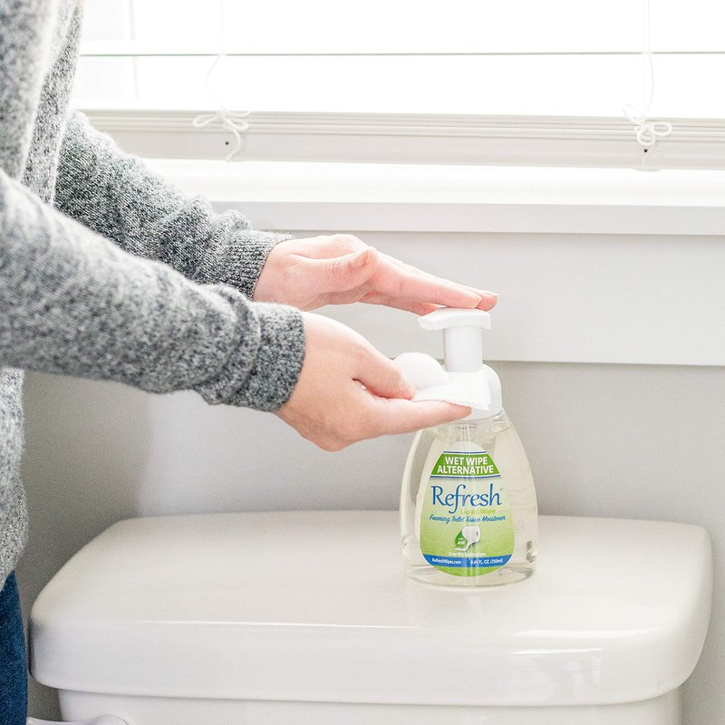 - WORKS IN ANY FOAM DISPENSER: Toilet paper alone doesn't really leave you clean. Refresh Liquid Wipe is gentle and moisturizing and converts the toilet paper you already have into a cleansing and soothing wipe, that is flushable and won’t clog your pipes. Original formula with witch hazel and aloe is gentle on normal skin types. Lightly Scented.