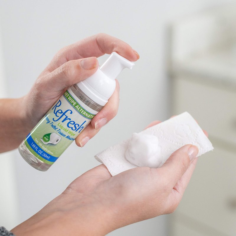 Refresh Liquid Wipe Toilet Paper Foam is The Original Flushable Wet Wipe Alternative that you Use Directly on Toilet Paper to Create a Custom Wipe! Formulated with Witch Hazel and Aloe to Cleanse and Soothe, Refresh Foam produces a foam that stays on top of toilet tissue for over a minute, allowing you to add a little or a lot depending on your personal preference. Standard flushable wipes come pre-soaked and they have to be strong enough to remain intact for use, which is why they cannot break down like toilet paper moments after being flushed. Also, you cannot customize the level of moisture with a standard flushable wipe the way you can with Refresh Liquid Wipe and toilet paper. Original Formula for normal skin types is lightly scented. The Alcohol-Free formula is perfect for sensitive skin types and it contains no parabens or added fragrance. Refresh Liquid Wipe Toilet Paper Foam Cleanses and Soothes to greatly enhance your personal hygiene routine because it Cleans Away what plain toilet paper leaves behind. Convenient Personal Size 50ml (1.69 oz) Foam and 2oz Spray bottles fit discretely in your pocket or purse and provide hundreds of applications. They provide roughly the same uses and cost about the same as a 50 pack of competitive flushable wipes. Economical 250ml (8.45 oz) Household Size contains four to five times as much Refresh as the personal size bottles at a fraction of the cost per use. The 8 oz Refill allows you to refill your bottles and it can be used in any automatic foam dispenser. Zero-waste, sustainable, and packaged in recyclable containers. Perfect for travel, office and at home. A must have for freshening up after a workout or road trip. Great for boaters and RVers, campers, runners and hikers.