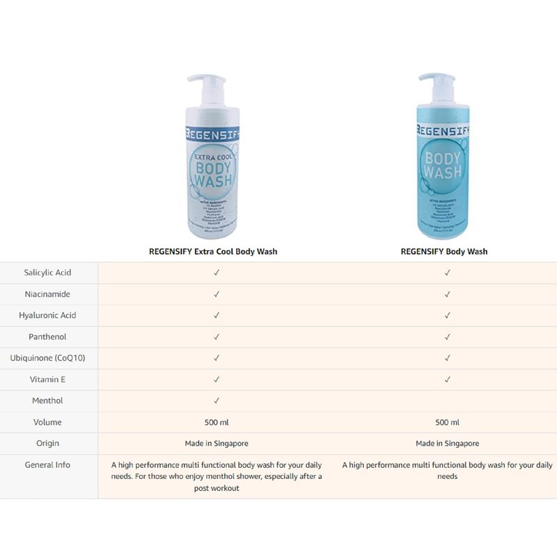 With a balanced pH formulation, our REGENSIFY Body Wash is optimally designed to cleanse, hydrate and nourish the skin. The combination of Salicylic acid and Niacinamide create powerful synergy, making our body wash effective in targeting different aspects of body acne and balance out the oil production in the skin. Salicylic Acid provides deep-cleaning properties that remove dirt and dead skin cells, as well as exfoliates and unclogs pores. Niacinamide soothes inflammation, repairs the skin and helps to reduce the appearance of uneven skin tone and pigmentation, giving a balanced and clear texture to the skin. By having hyaluronic acid mix with panthenol, it creates deeper hydration to the skin. With CoQ10, it restores mitochondrial energy and fights skin aging.