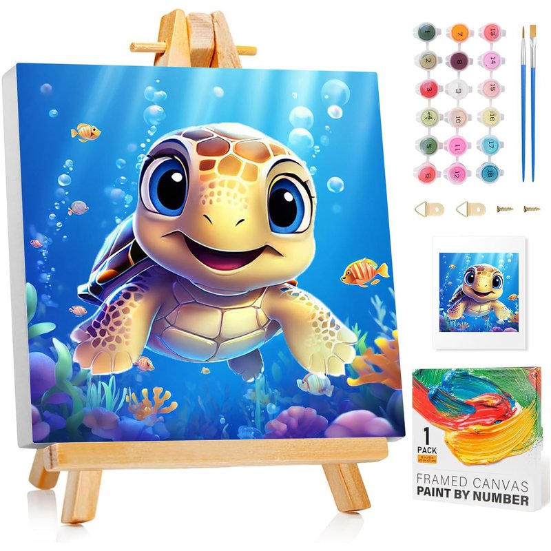 Reivworl Paint by Numbers Kit for Kids with Frame, Sea Turtles Kids Paint by Number Kits, Kids Paint by Number Kits Age 5-8 for Gifts and Home Decor (8X8Inch)