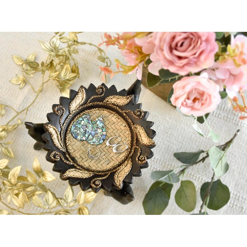 Add a touch of Artisan craftsmanship to any setting with this beautiful circular wooden tray. This amazing tray is carved of rain tree wood by Artisan Aree and showcases three elephants in a triumphant stance. The inside of the tray and the leaves are lined with interwoven rattan. PLEASE NOTE: The handcrafted nature of this product will produce minor differences in design, sizing and weight. Variations will occur from piece to piece, measurements may vary slightly.