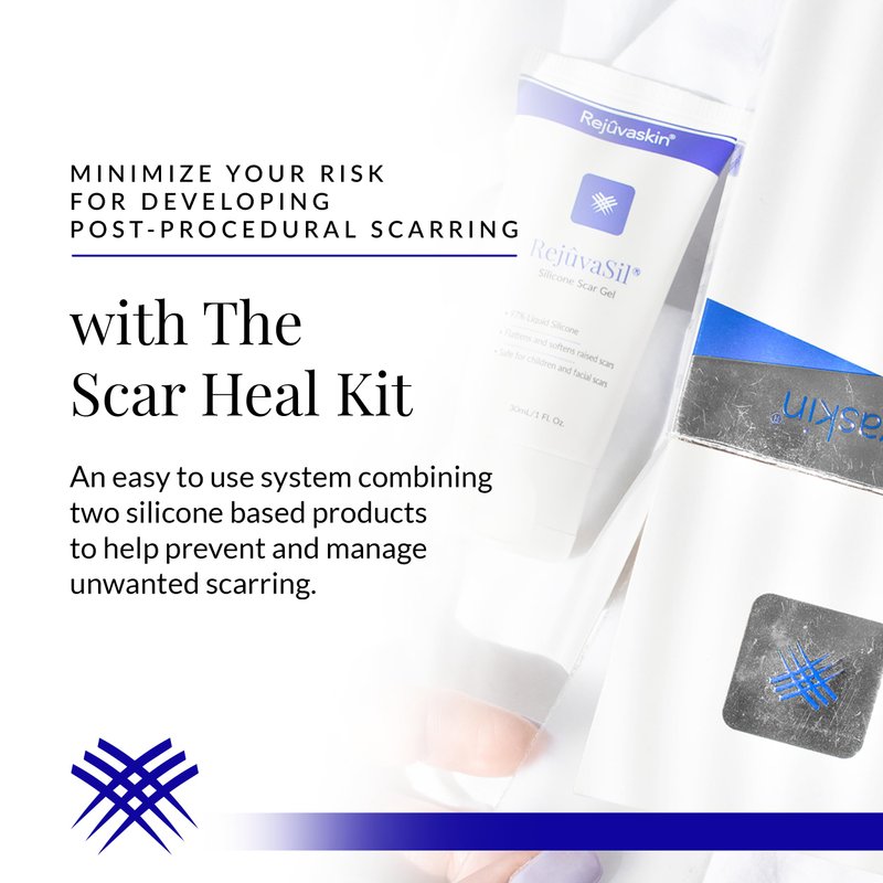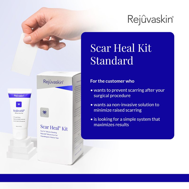 - Silicone Scar Heal Kit Contains - (1) 1.5" x 5" Scar Fx Silicone Sheets, (1) 30 ml of RejuvaSil Silicone Scar Gel, and (1) roll of hypoallergenic medical tape. This combination is ideal for small surgical scars, small scars from injuries, and small orthopedic procedures in small to medium scar surgery