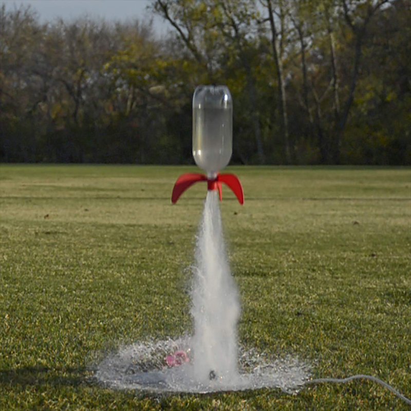 StratoFins will guide your rocket to lofty heights with straight flights instead of tumbling through the air. StratoFins are made of durable plastic and screw-on to a 2 liter soda bottle or smaller. This version ships with a rubber stopper launcher for a complete economical package. These fins are compatible with 95% of all available launchers either homemade or commercially available in the marketplace if you want to upgrade the launcher at a later time. StratoFins requires no tools or glue for assembly. The StratoFins kit includes 1 attachment ring, 3 fins, 1 rubber stopper launcher along with an instruction sheet that provides information for creating a nose cone and several launching tips. Assemble StratoFins by sliding each fin down a separate slot on the attachment ring beginning from the top. With all fins in place screw the attachment ring onto a soda bottle until snug. This water rocket can be launched with or without a parachute attached since this configuration does not nose dive, but instead tumbles gently back to the ground provided the nose cone is not permanently attached. Great item for people of all ages for fun, science projects, school classes, parties, etc.