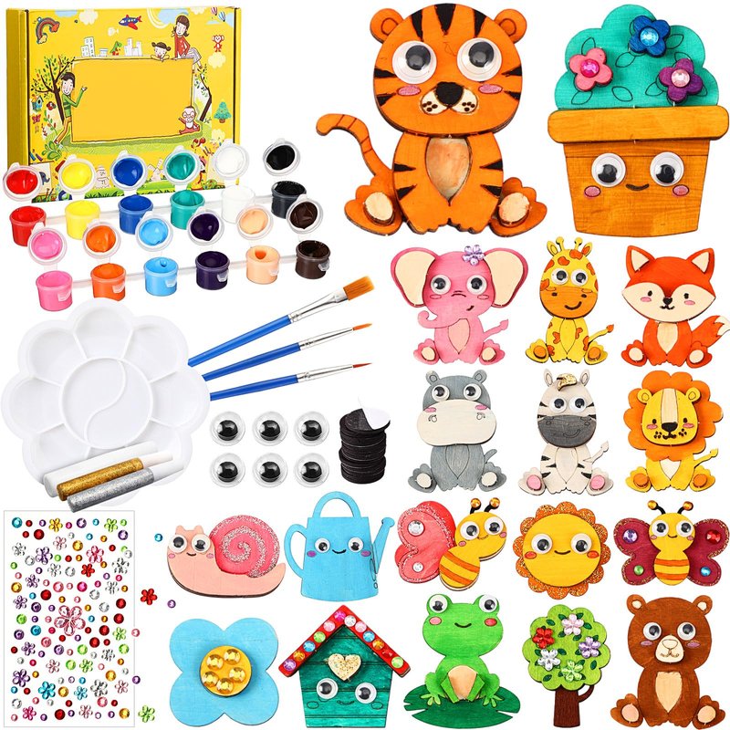 - DIY Wooden Magnet Painting Kit: our painting craft activities kit includes 18 wooden crafts, 18 magnet stickers, 16 googly eyes, 4 brushes, 2 glitter glue (gold and silver), 1 paint palette, 2 sets of color paints (totaling 12 colors), 1 sheet of diamond stickers and 2 glue; Escape into your creative world with our wooden crafts