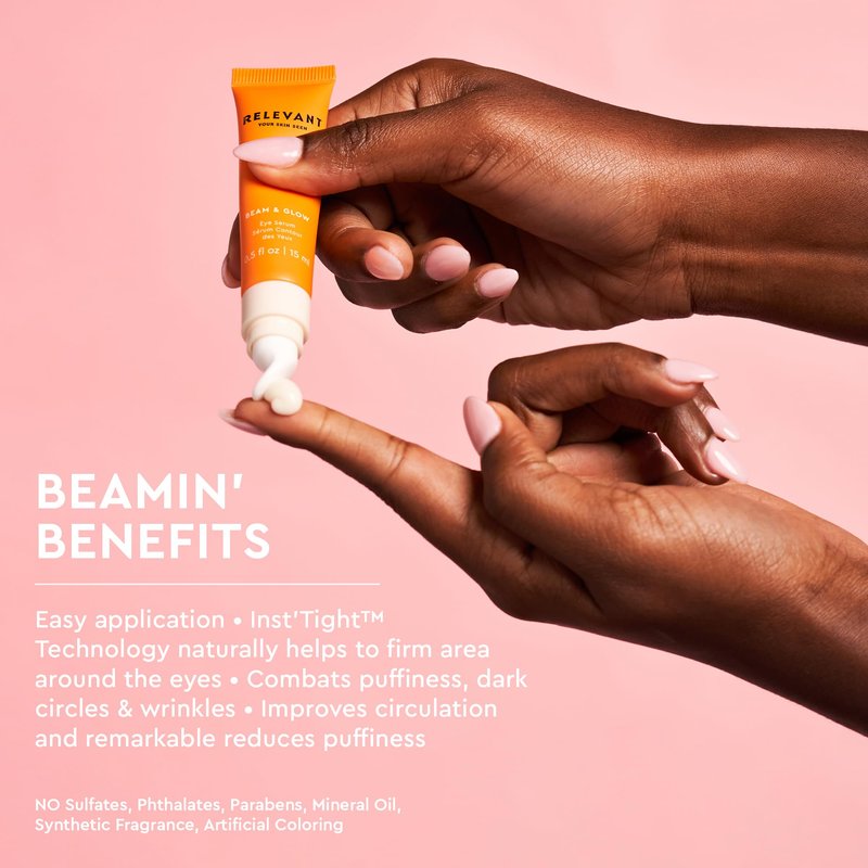 - Relevant Beam + Glow Eye Serum: A super-hydrating eye serum that features our Inst’Tight eye tightening technology to instantly minimize the look of fine lines, wrinkles, dark circles, puffiness and sunspots - for brighter, radiant skin.