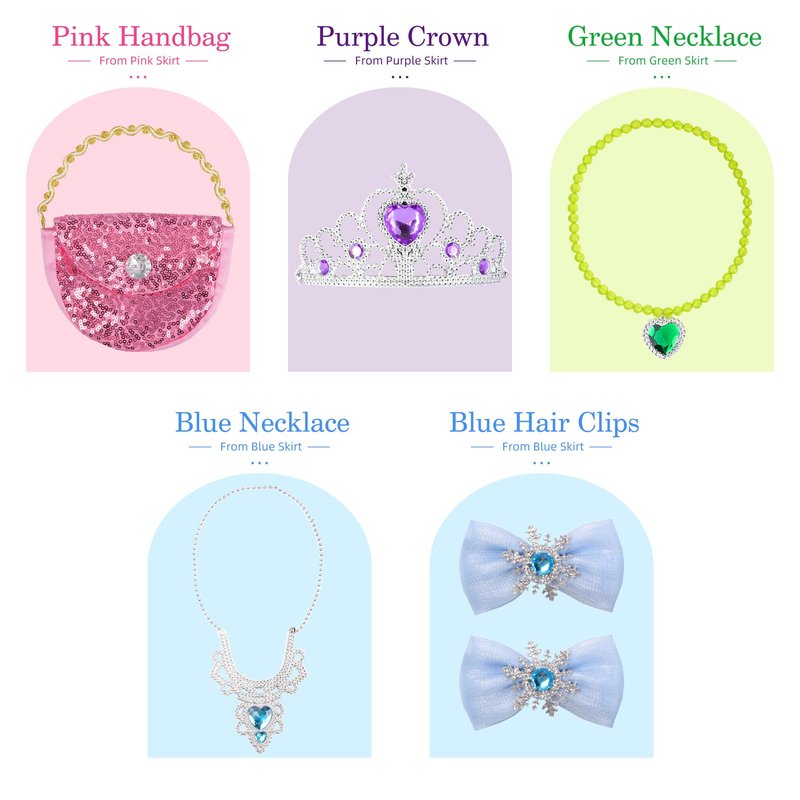 - Girl Role Play Costume Gift Set:Four different princess role play sets, including four tops, four skirts, 2 crowns, 2 blue hair clips, 1 purple hairpin and 1 sequined handbag. The split design and rich accessories can be matched at will to create your own unique princess image, highlighting your personality and personal style
