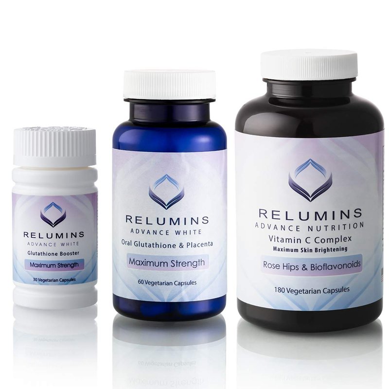 Relumins Advanced White Oral Lightening Formula - 60 capsules (30 day supply) Relumins is 5X more effective than Ivory Caps & more than twice as effective as Gluta-C oral lightening formula. This formula combines powerful skin lightening with the rejuvenating properties of placenta. Rose Hips boost the skin's defenses and fight pigmentation. Rich omega fatty acids infuse the skin with moisture from within.