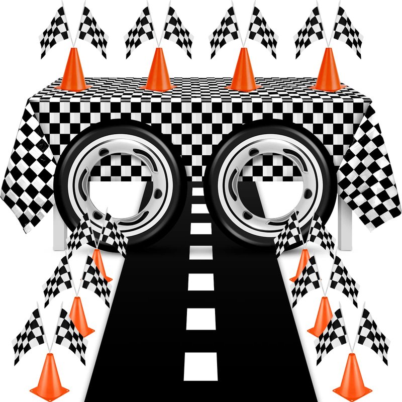 - Racing Birthday Party Supplies: the package comes with 12 pieces of racecar flags, 1 piece black and white checkered tablecloth, 1 piece black runway carpet, 8 piece orange cones and 2 pieces swim rings; The quantity is enough for you to decorate your race car themed parties or share with your mates