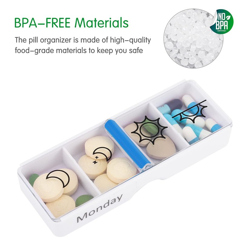 - WEEKLY 4-TIMES A DAY - Trays feature four compartments for morning, noon, afternoon and night. The trays have been smartly designed so only one compartment can be accessed at a time.