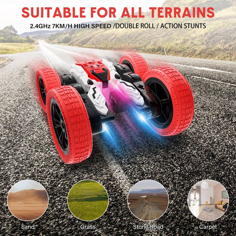- RC STUNT CAR: 360-Degree rotation on dual-sides, race to drift and flip the RC car all around. This RC stunt car for kids will spin like a crazy cyclone with cool lighting effects. You can control the RC cars in any direction with its remote controller.