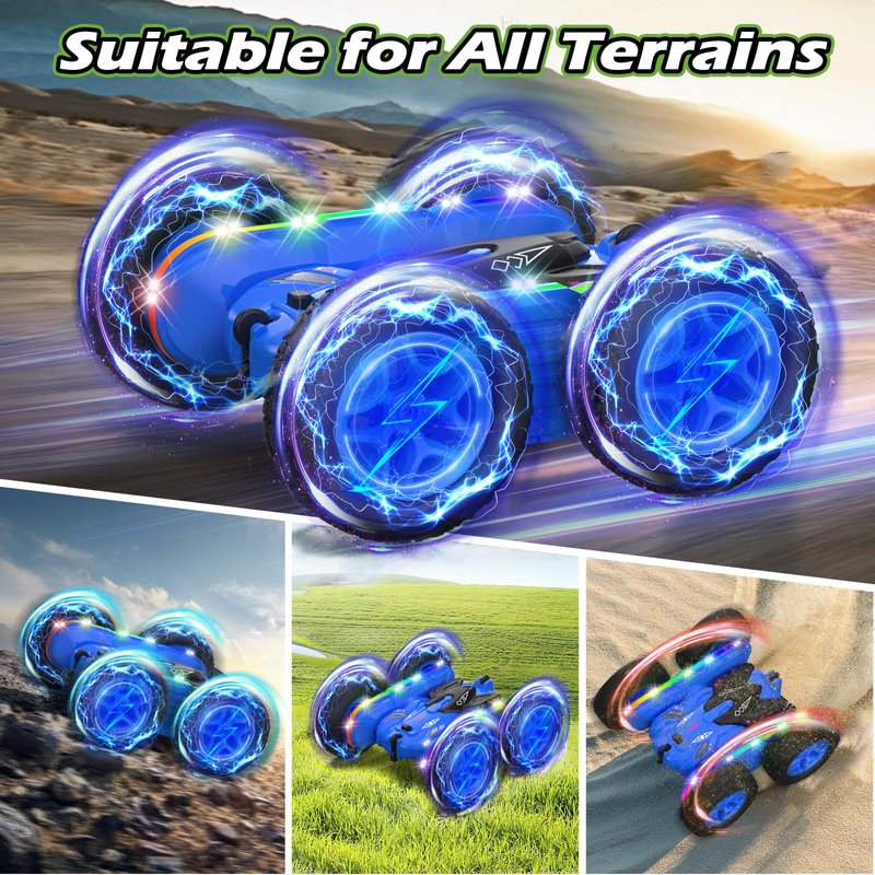 - RC STUNT CAR WITH COLORFUL STRIP LIGHT: This remote control car has 2 colorful LED strips and 2 headlights that will automatically flash in different colors, which is an awesome RC car toy for kids. Double sides running, moving forward, backward, turning left, right, 360-degree tumbling flip to bring kids a fantastic driving experience.