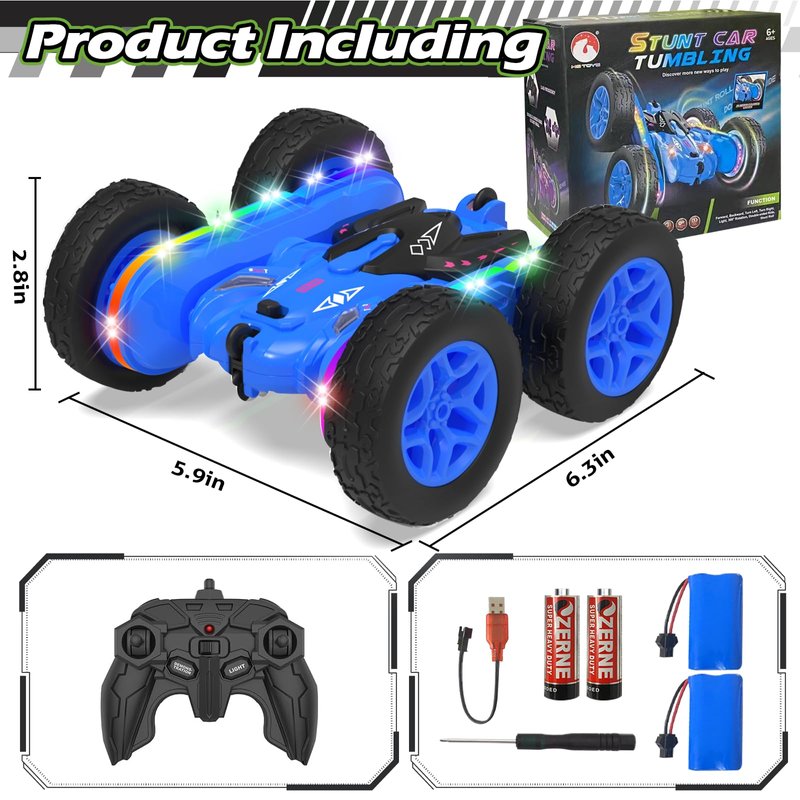 - IDEL GIFT FOR KIDS: RC stunt Car comes with 1*RC Car, 1*remote control, 2*rechargeable battery modules, 2*1.5V AA batteries, 1*charging cable, 1*screwdriver, 1*user manual to make sure kids enjoy the toy car as soon as got the package. This exciting RC car will be a great gift for kids 6 7 8 9 10 11 12 as the birthday Xmas present. If you have any questions about our RC stunt car, please contact us promptly. We will try our best to make you satisfied.