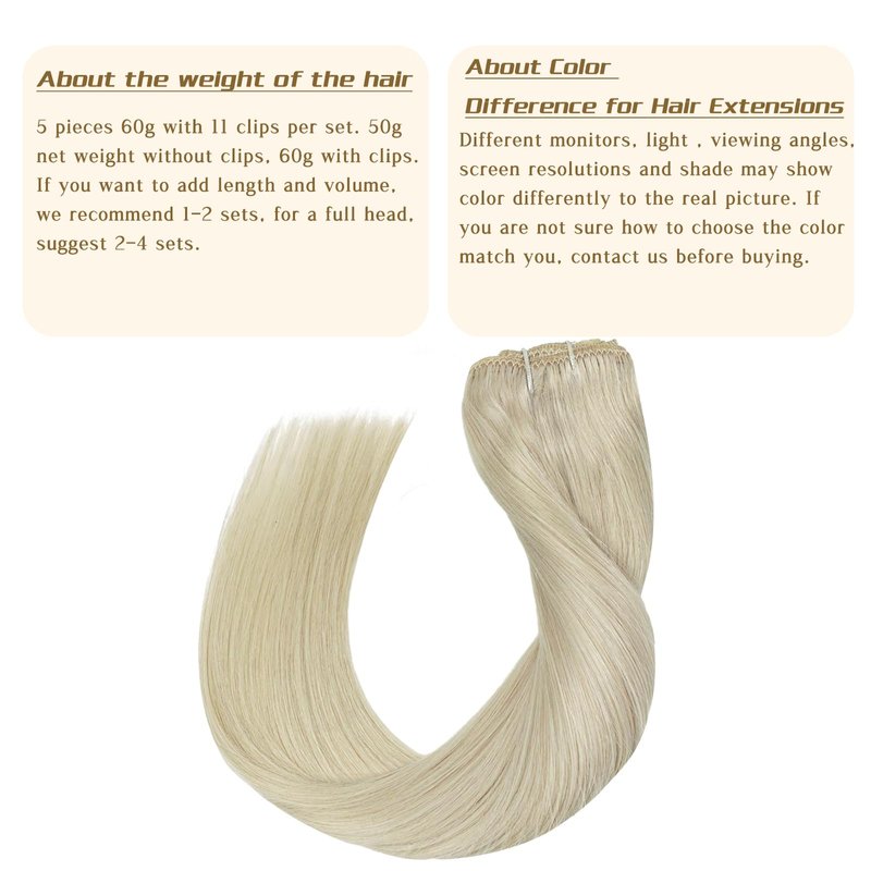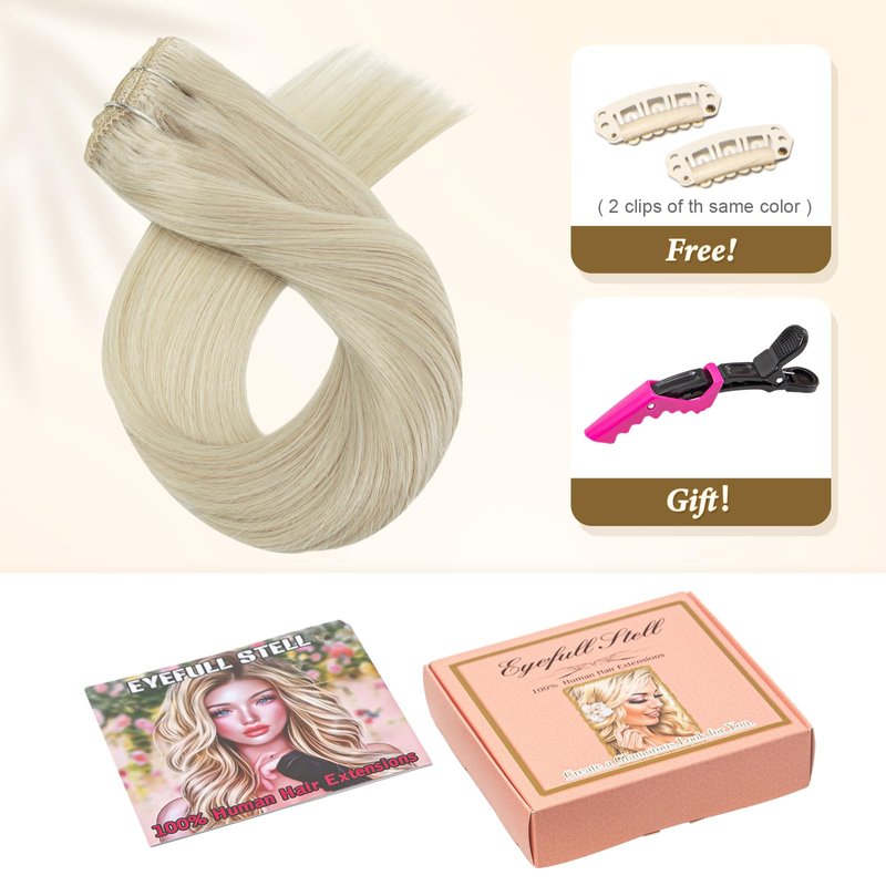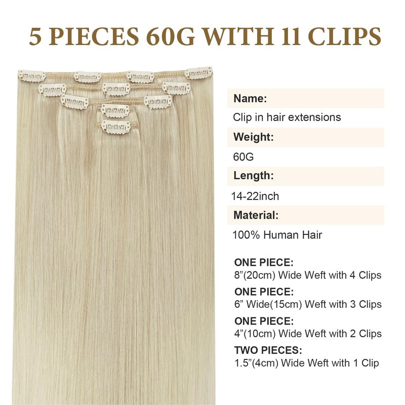 - 【Clip in Hair Extensions Specification】Eyefull Stell clip on human hair extensions, 5 pieces 60g with 11 clips per set. 50g net weight without clips, 60g with clips, can effectively add highlights without weighing down your hair too much. If you want to increase the length and the thickness, please buy more packs. We recommend buying 2-4 packs for a natural & full look. Also, we offer 2 replacement clips and an alligator clip.