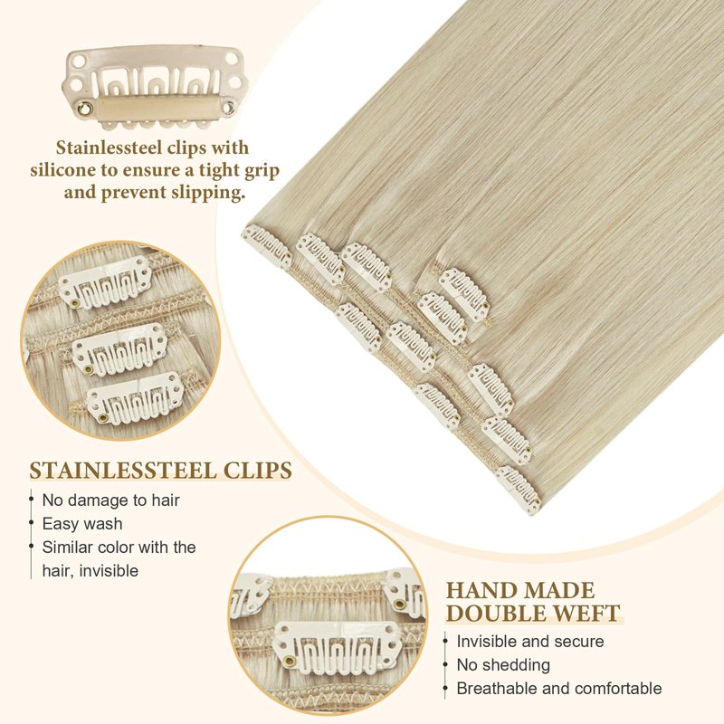 - 【Comfortable & Secure & Quick to Wear】Stainlessteel clips with silicone to ensure a tight grip and prevent slipping, no damage to hair and scalp. Unlike other hair extension types, natural straight clip in human hair extensions for women can be worn and took off freely within 5 minutes by yourself to change hairstyle for different occasions. (Wedding, Concerts, Make-up Parties, Dating, Prom and on). Even if it's your first time wearing a hair extension, you can easily handle it.