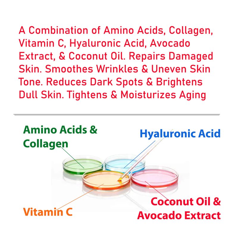 - HIGH CONCENTRATION OF VITAMIN-C: repairs damaged skin by erasing dark spots, diminishing wrinkles & tightening skin, and making your skin glowing.
