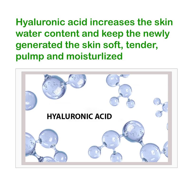 - HIGH CONCENTRATION OF HYALRONIC ACID: the best agent to increase skin's water content; plus, avocado extract, Shee butter, & Q-10 supper hydrate the newly regenerated skin.