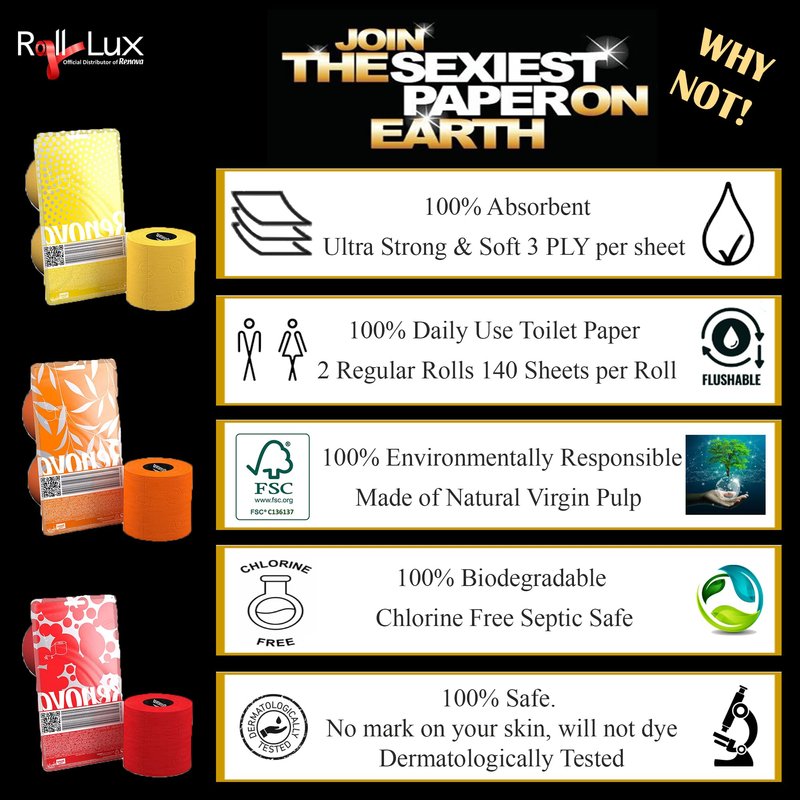 THE 'SEXIEST' PAPER ON EARTH. Brighten up your bathroom in a colorful and scented way and make your toilet a little more exciting. Very soft and absorbent, this pack of 2 Renova luxury toilet tissue roll paper 3-ply will add vivid colors in your bathroom in seconds. For its intended use, these colored rolls are, dermatological and gynecological tested and approved. Also, colorfast, it will not dye or mark your skin. It is 100% biodegradable, made of Virgin Pulp (means that the bathroom tissue was produced with cellulose fibers from woods, and it does not contain any recycled content in its formulation). It´s considered a high-quality paper. Additionally, this luxury bath tissue features an elegant embossed drop shape and a perfumed black cylinder. This light Sandalwood fragrance will release a soft and subtle smell. Also, manufactured under high controls, our toilet tissue is of exceptional quality and delivers the softness and strength you look for. Moreover, all Renova toilet paper is sourced from responsibly managed forest (FSC certified).This toilet paper is the ultimate accessory for your contemporary bathroom, and would make a most funky gift for anyone with an equal sense of both humour and style. Just imagine the surprise on your guest’s faces when they spot this funky tissue for the first time! Perfect as a thoughtful gift for any occasion: Christmas, Birthday, House Warming Party, Thanksgiving or Mother’s Day for your wife, mother, girlfriend or daughter.