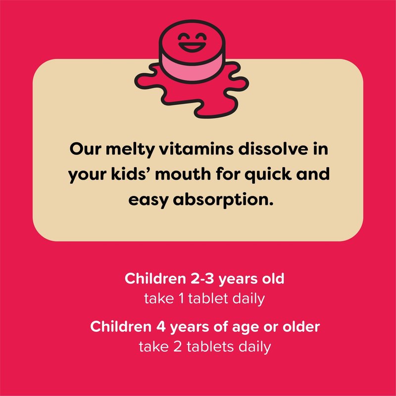 - How to take: Children 2-3 years old take 1 tablet daily; children ages 4 and older take 2 tablets daily; our vitamins melt in your kids’ mouth or can also be dissolved in water, juice or even smoothies