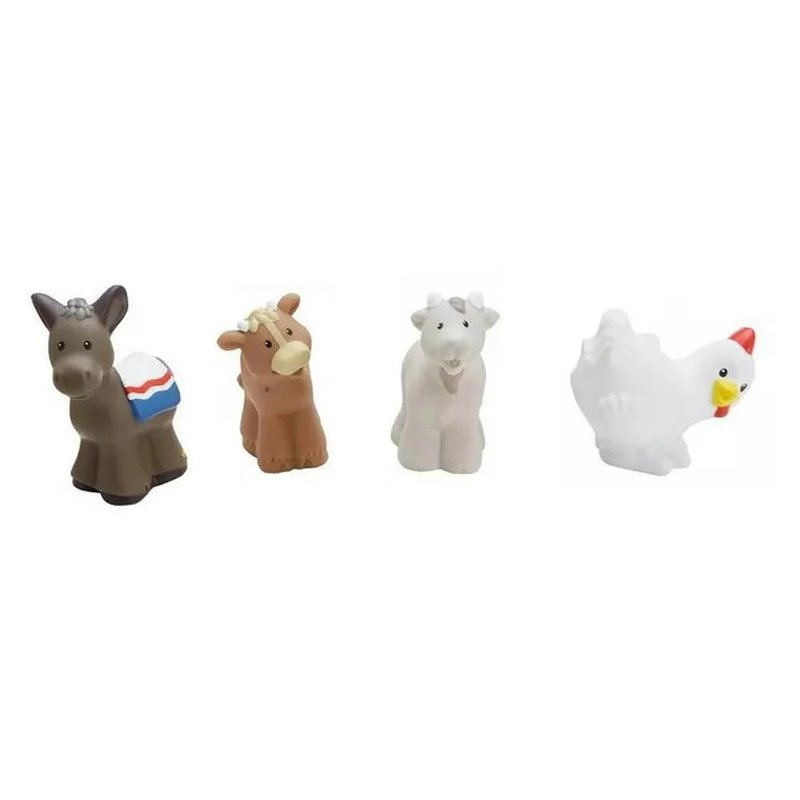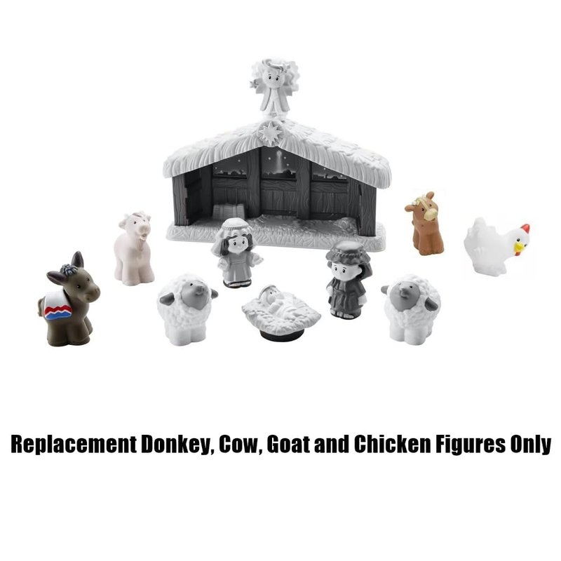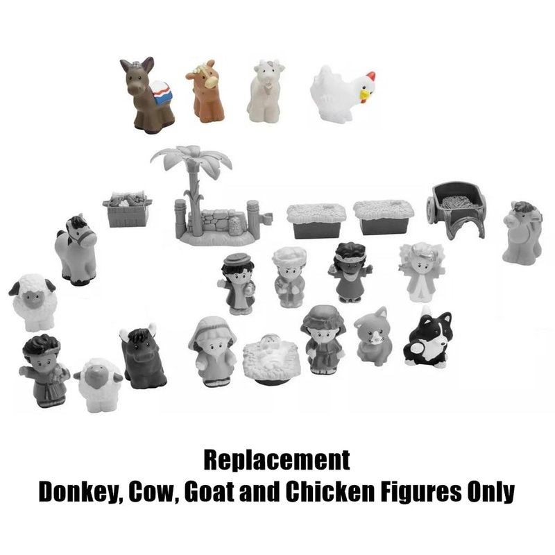 Replacement part for Little People toddler Nativity figure playset HMX70. Works great with many figure playsets, including farms and zoos. Includes a gray donkey, a brown cow, a gray goat and a white chicken.