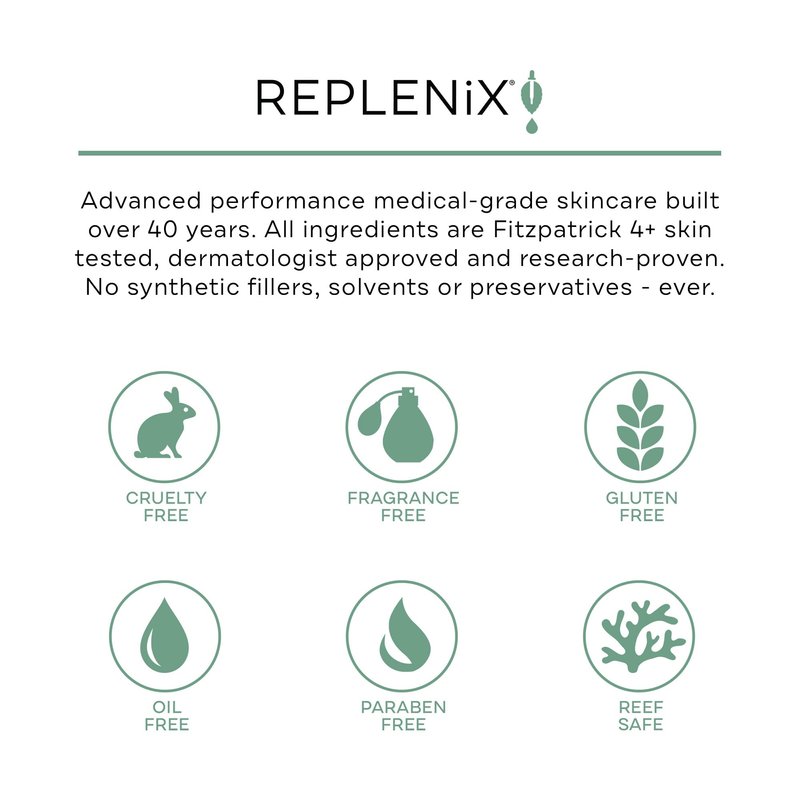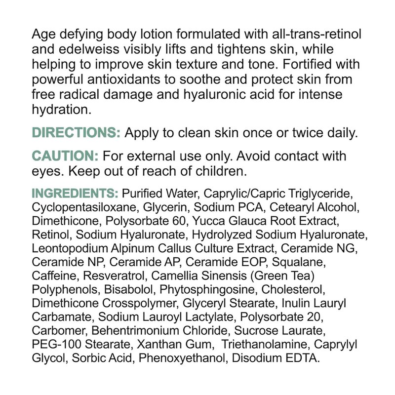 This skin-firming body lotion deeply nourishes and restores skin with a proprietary blend of medical-grade All-Trans-Retinol and Edelweiss Flower to help visibly lift and tighten skin while helping to improve skin texture and tone. Our proprietary Green Tea Polyphenol Technology helps deliver antioxidant protection to prevent damage from free radicals and external stressors. This body lotion helps reduce the appearance of cellulite as healthy collagen production is stimulated, helping to smooth out visible signs of aging like wrinkles and diminishing age spots. Replenix skin technology has been recommended by dermatologists for over 40 years. Every single ingredient used in our skincare solutions is of the highest purity and most stable form. No synthetic fillers, solvents, or preservatives ever.